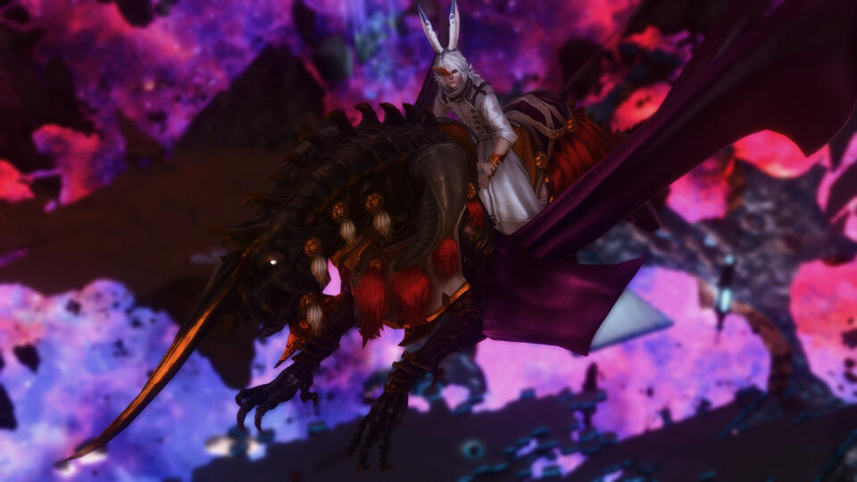 He has a chocobo named Chulainn, who came from stolen Gold Saucer stock. The bird was one of the first things he purchased with coin earned from his work with the Lemures. The bird was retired to a sanctuary in the Twelveswood after sustaining an injury during his time in Nagxia.He was given Grani by Emet-Selch, and now uses it as his primary mount.